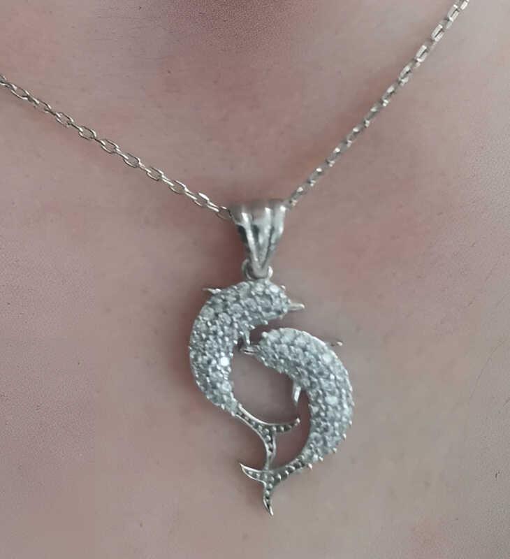 Dolphins are our only friends with their love for humans. We have reflected these cute friends of ours in this stylish design necklace for you. This necklace model full of love is a perfect option that can be preferred on special occasions as a birthday gift, Valentine's Day gift or a gift for mothers. Necklace; It is made of 925 sterling silver. Rhodium plating is applied on silver. Necklaces with rhodium plating preserve their shine for a long time and oxidation is delayed. As with other necklaces, the silver double dolphin women's necklace is also handmade. There may be a ± 10% deviation in the specified average product weight due to silver and precious stones.