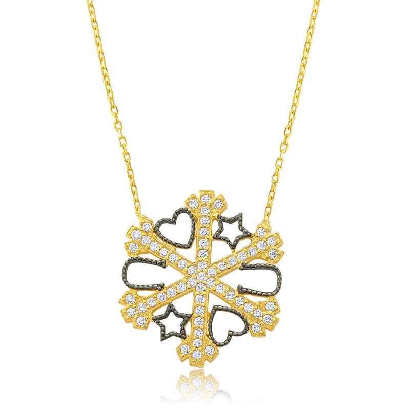 Snowflake is the symbol of purity and innocence. As it is known, when snowflakes are examined under a microscope, it is seen that each snowflake is different and unique, that is, each snowflake is unique and has no equivalent. Snowflake and the horseshoe, star, and heart symbols inside will bring you luck. This snowflake lady luck necklace, which has an extremely stylish design as an accessory, can be used in daily life or on special occasions if you wish. An ideal model for those who want to give a unique gift to their loved ones. Snowflake lady luck necklace is made of 925 sterling silver. Silver is gold plated. Silver lady necklace models that are gold plated maintain their shine for a long time and oxidation is delayed. The white stones on the necklace are zircon. The silver chain length is 45 cm on average. As with all silver lady necklace models, the silver snowflake lady luck necklace is also produced entirely by hand. There may be a ± 10% deviation in the specified product weight due to silver and precious stones.