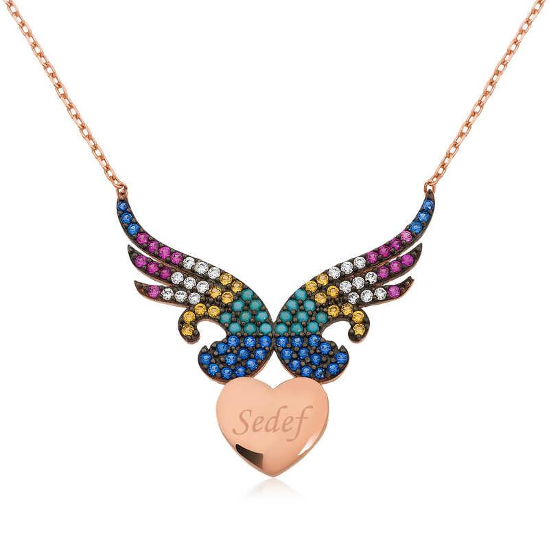 The personalized winged heart necklace that tells that your loved one's heart is under your wings will be one of the most beautiful accessories that will help you express your feelings. The winged heart women's necklace, one of the most meaningful gifts that you can make your loved ones happy, is made of 925 sterling silver. Rose gold plating is made on silver. Rose plating gives silver its pink color. Silver women's necklace models with rose plating preserve their shine for a long time and oxidation is delayed. The stones on the necklace are zircon. The average silver chain length is 45 cm. The silver personalized winged heart women's necklace is handmade. There may be ± 10% deviation in the specified product weight due to silver and precious stones. Note: Please indicate the name you want to print in the notes section, returns cannot be accepted for products with a name written on them.