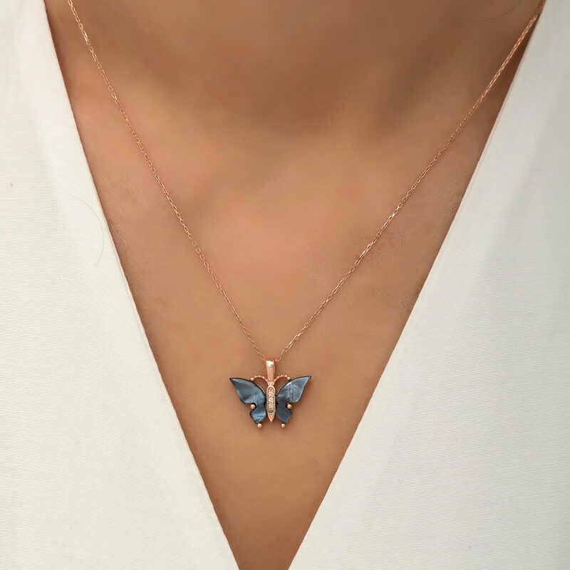 Tiger's eye, a quartz group stone, is one of the most valuable healing stones. It gains a silky appearance when polished. Tiger's eye stone is a stone with iridescent properties. It is generally used as jewelry. It is known that tiger's eye stone is good for asthma diseases. It also shows its relaxing effect by stepping in in case of nervous system disorders. It is a great balancer in emotional terms. Butterfly; is one of the most popular motifs preferred by women. It reminds its lovers of the mystery of nature and the richness of human imagination. Butterflies, which symbolize freedom, innocence and purity, are the expression of pure love and passion. Anthracite Tiger's eye Stone butterfly women's necklace, which you and your loved ones will enjoy wearing, will be one of the best gifts for your loved one. The necklace is made of 925 sterling silver. Rose coating is applied on silver. Silver women's necklaces with rose coating preserve their shine for a long time and delay oxidation. The average silver chain length is 45 cm. As with all silver women's necklaces, the silver Anthracite Tiger's eye Stone butterfly women's necklace model is also produced by hand. Due to silver and precious stones, there may be a ± 10% deviation in the stated average product weight.