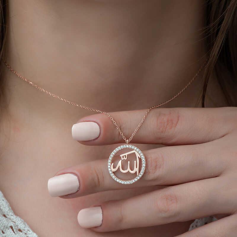 Religion is a system based on belief with a spiritual aspect. Allah is the absolute and sole creator of the entire universe and all living and non-living beings. It is a special accessory that believers with these thoughts may want to carry and will not part with in their daily lives. This stylish necklace model will be a meaningful way to express spiritual feelings. This necklace with a stylish design will give you and your loved ones peace. The women's necklace with Arabic Allah written on it is made of 925 sterling silver. Rose coating is applied to silver. Silver women's necklace models with rose coating preserve their shine for a long time and oxidation is delayed. The stones on the necklace are zircon. The silver chain length is 45 cm on average. As with all silver women's necklace models, the silver rose Arabic Allah written women's necklace model is also produced by hand. There may be ± 10% deviation in the specified product weight due to silver and precious stones.