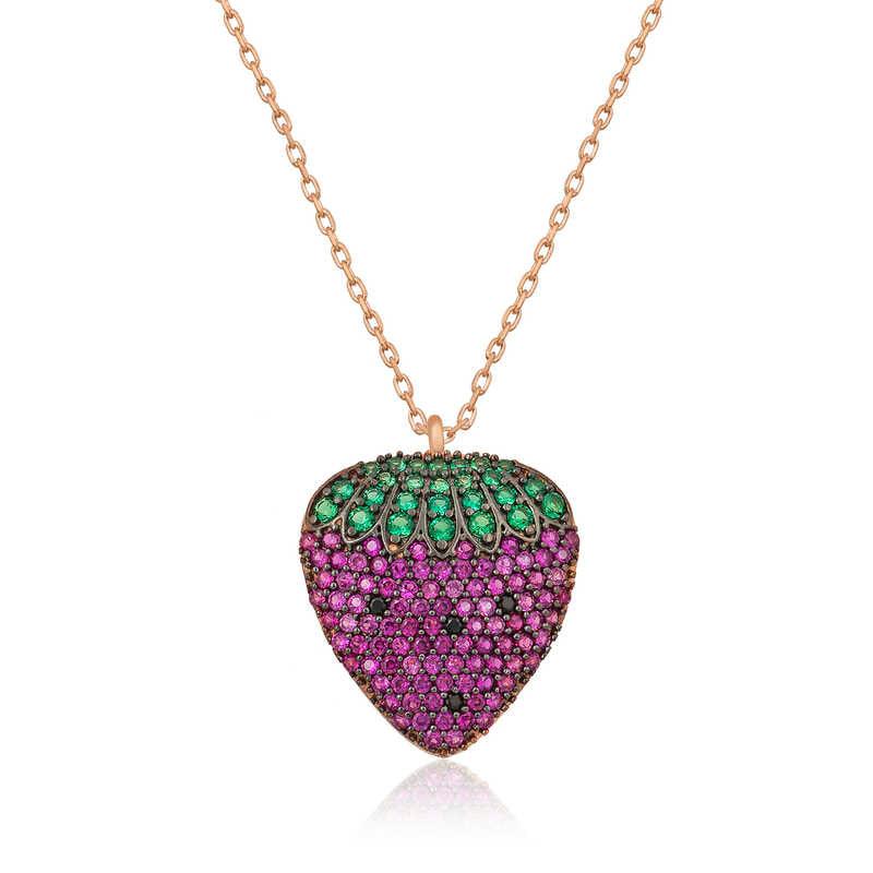 If you are in favor of difference, this necklace is just for you... Strawberry, one of the most popular fruits of the summer months, meets you this time with a silver necklace design. You can gift the silver strawberry necklace to your lover or all your loved ones on your birthday, anniversary, New Year's Eve and Valentine's Day. Rose gold plating is made on silver. Silver women's necklaces with rose gold plating preserve their shine for a long time and oxidation is delayed. Rose gold plating gives the copper color to silver. As with all women's silver necklaces, the silver strawberry necklace is also handmade. There may be a ± 10% deviation in the specified product weight due to silver and precious stones.