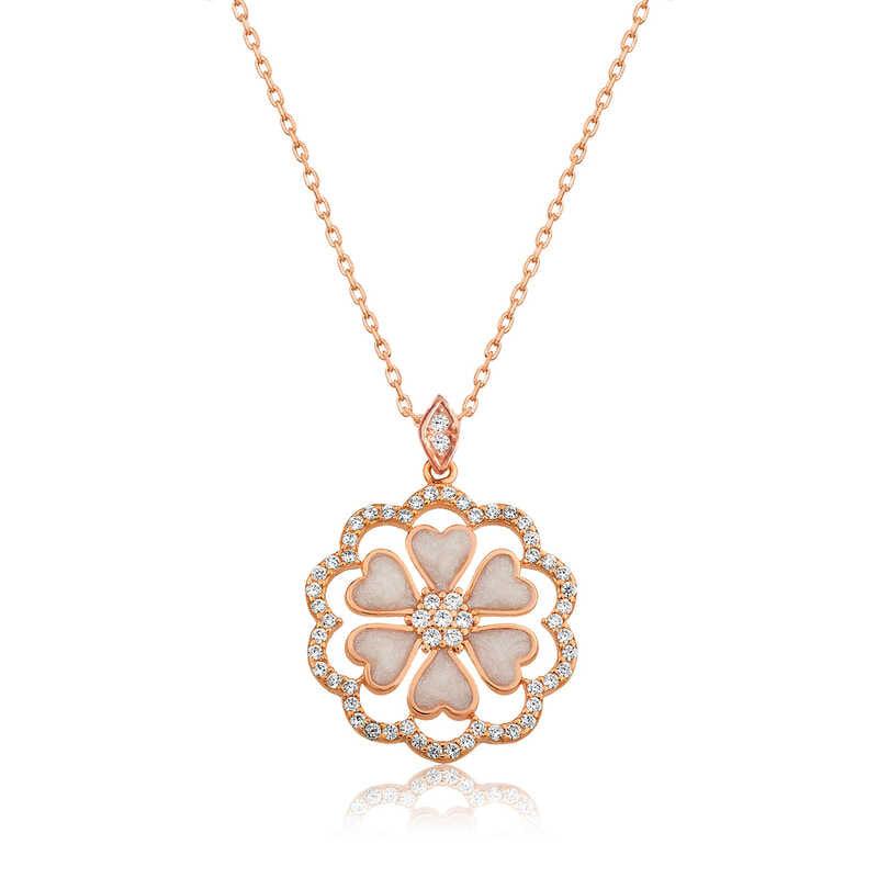 The stylish flower patterned silver necklace model consisting of heart leaves is a nice accessory that you can enjoy using and gifting to your loved ones. The specially designed women's necklace model consisting of heart-leaf flowers is made of 925 sterling silver. This elegant necklace will be a very stylish option that young lovers can choose on special occasions. Adorn your loved one's neck with love with this special necklace. The silver heart flower women's necklace model has rose gold plating and white mother-of-pearl enamel. Silver women's necklace models made of rose gold plating preserve their shine for a long time. The silver heart flower women's necklace will be one of the most beautiful gifts that your loved ones will enjoy wearing as much as you. As with all our silver women's necklace models, the silver heart flower women's necklace is also handmade. There may be a ± 10% deviation in the specified average product weight due to silver and precious stones.