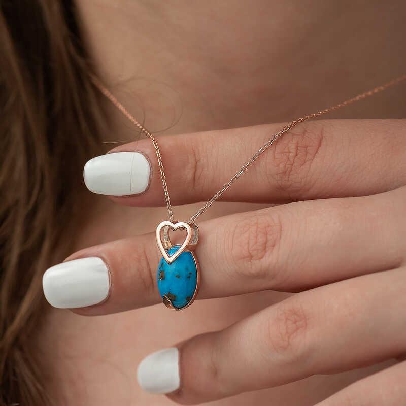 Silver turquoise stone adorned heart women's necklace is a wonderful model that you can use with pleasure and give as a gift to your loved ones. Silver women's necklace is made of 925 sterling silver. Rose coating is applied on silver. Silver women's necklace models with rose coating preserve their shine for a long time, oxidation is delayed. The average silver chain length is 45 cm. The stone on it is turquoise. As in all our silver women's necklace models, the silver turquoise stone heart detailed women's necklace model is also produced by hand. There may be ± 10% deviation in product weight due to silver and precious stones.