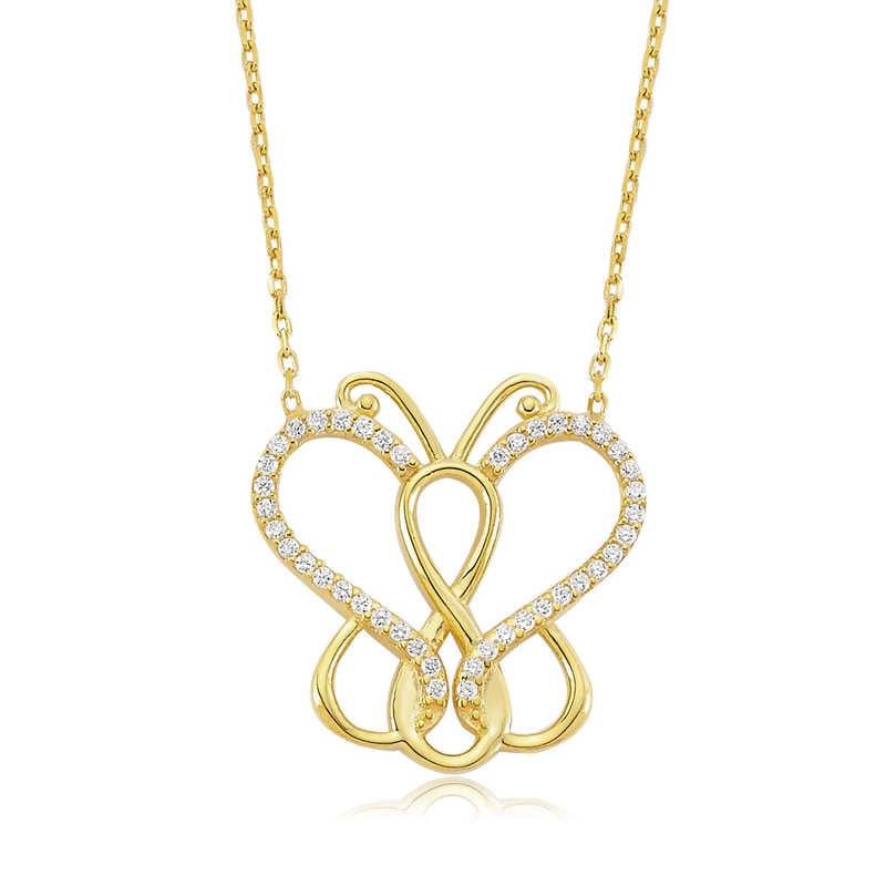 Butterfly necklace is an expression of pure love and affection. It is a necklace model that you can show your eternal love to your loved one. This stylish butterfly women's necklace, a meaningful gift that you can buy for your loved ones, is made of 925 sterling silver. Gold plating is applied on silver. Silver women's necklace models that are gold plated preserve their shine for a long time and oxidation is delayed. The white stones on the necklace are zircon. The silver chain length is 45 cm on average. The silver infinity butterfly women's necklace model is handmade like all other silver women's necklace models. There may be a ± 10% deviation in the specified average product weight due to silver and precious stones.