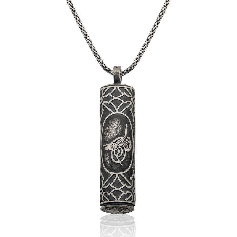 Tughra means the signature of the Ottoman sultans. Each tughra expresses the name, existence and reign of the sultan it belongs to. The tughra symbol has survived to the present day in many ways, different for each sultan. The tughra has been preserved in every period of the Ottoman Empire and has never lost its importance. And over time, it has also had an important place in our calligraphy and is kept alive artistically by calligraphers today. You can enjoy using this silver necklace that reflects this art. You can place anything you want, such as prayers, etc. that you want to carry with you all the time. The cylinder amulet model with a tughra that can be opened is made of 925 sterling silver. Oxide coating is applied to the silver. Silver necklace models with oxide coating preserve their first-day appearance for a long time. As with all silver necklaces, the entirety of the cylinder amulet necklace model with a silver tughra pattern is also produced by hand. There may be a ± 10% deviation in the average product weight specified due to silver and precious stones.