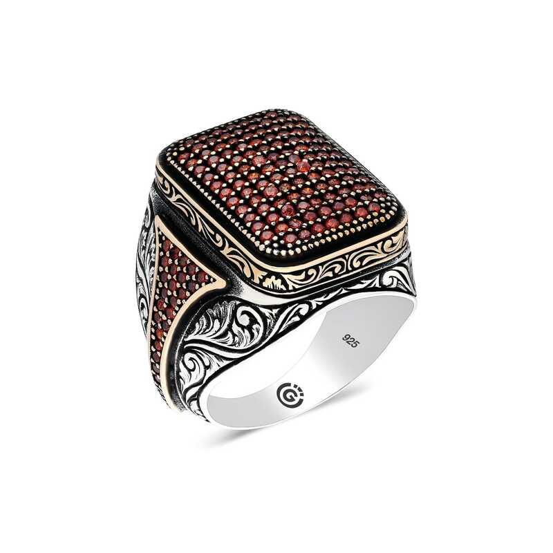 This men's ring model, consisting of zircon red stone stones on silver, is a stylish accessory that you can use at any time of the day. You can gift this ring to yourself or your loved ones on birthdays, father's day or special days. The red stone men's ring model is made of 925 sterling silver. Oxide coating is applied to silver. Silver men's ring models with oxide coating preserve their shine for a long time. As with all men's rings, the silver zircon red stone men's ring model is also produced by hand. There may be a ± 10% deviation in the specified average product weight due to silver and precious stones.