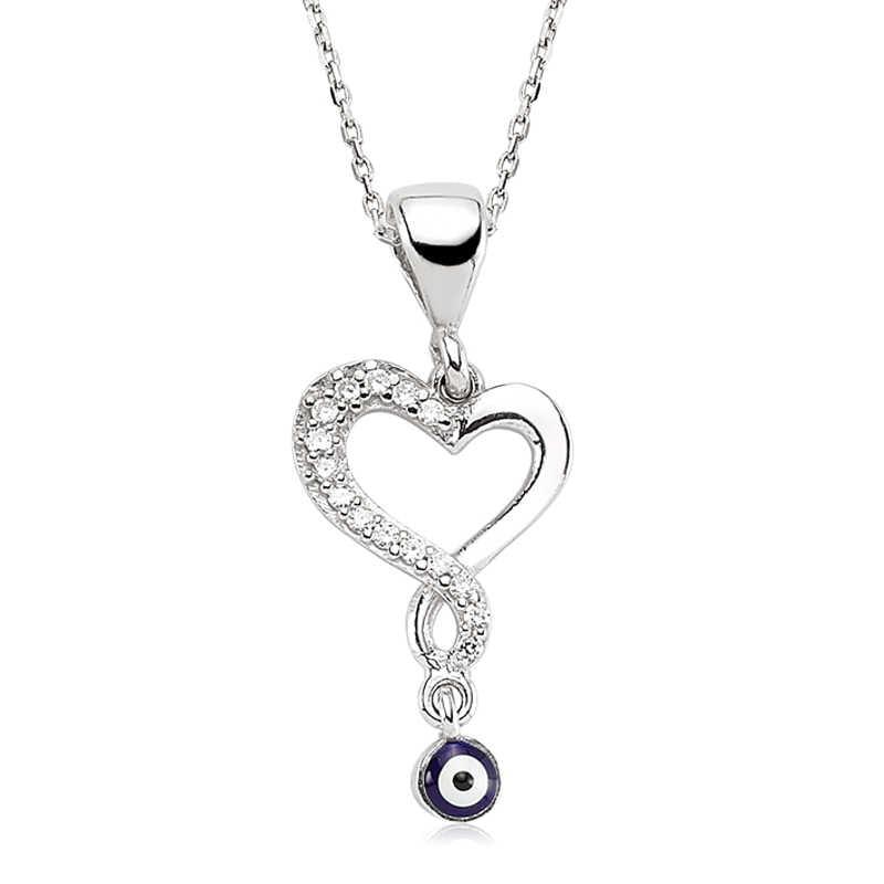 This wonderfully designed heart necklace model, part of which is stoned in the heart pattern, is made of 925 sterling silver. Necklaces with heart designs evoke love. Therefore, a silver heart necklace can also be a nice gift option. The evil eye bead protects you from evil eyes. Zircon stones are used on this necklace. Rhodium plating is applied to the silver to delay oxidation and preserve its shine for a long time. The chain length, which is completely silver, is an average of 45 cm. This evil eye women's heart necklace model is handmade, as are other silver women's heart necklace models. There may be a ± 10% deviation in the specified average product weight due to silver and precious stones.