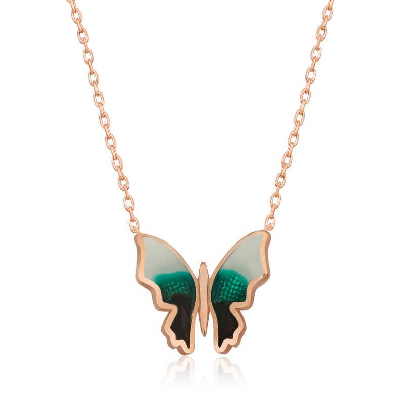 Butterflies symbolizing freedom, innocence and purity are the expression of pure love and passion. Spring butterfly necklaces mean that love starts with a small spark, then grows with great patience and finally declares love. Minimal butterfly women's necklace that you and your loved ones will enjoy wearing will be one of the most beautiful gifts. Necklace is made of 925 sterling silver. Rose coating is applied on silver. Silver women's necklaces with rose coating preserve their shine for a long time and delay oxidation. The colors on the necklace are enamel work. The average silver chain length is 45 cm. As with all silver women's necklaces, the silver minimal butterfly women's necklace is also handmade. There may be ± 10% deviation in the specified product weight due to silver and precious stones.