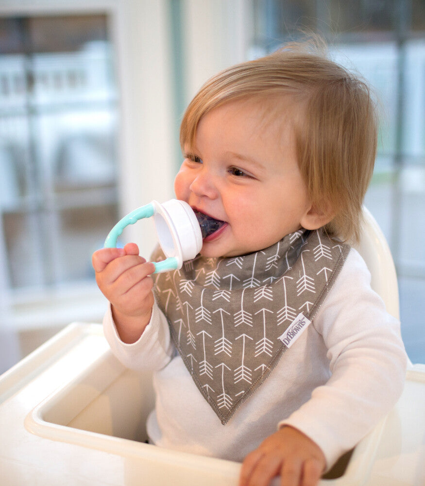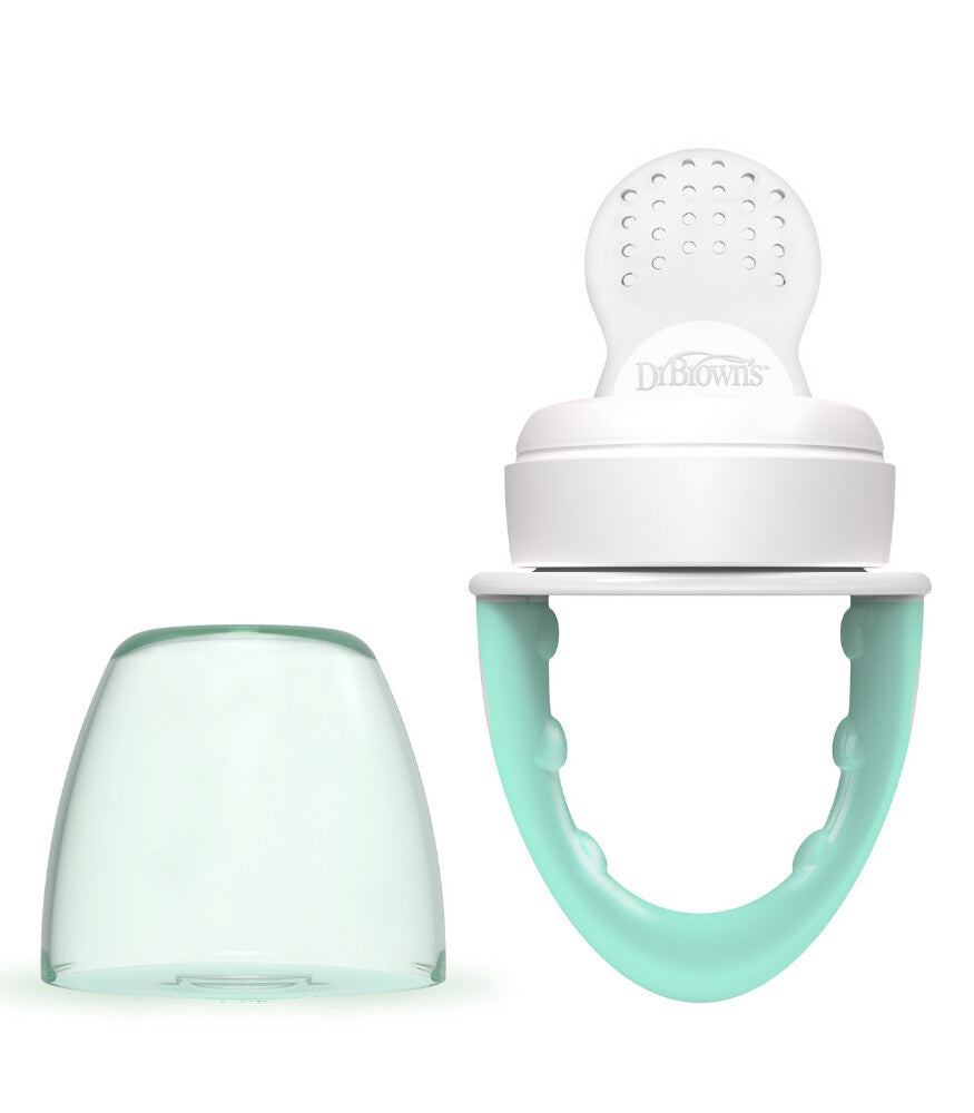 The Fresh Firsts Silicone Feeder has small holes that allow enough food to pass through for baby to safely self-feed.