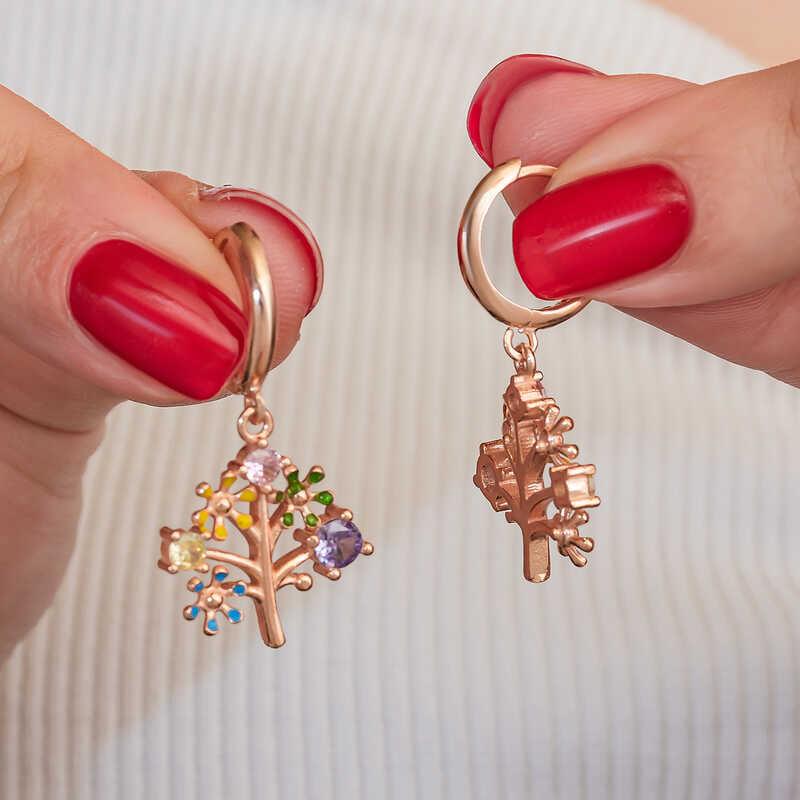 Gümüş Rose Renkli Taşlı Hayat Ağacı Kadın Küpe