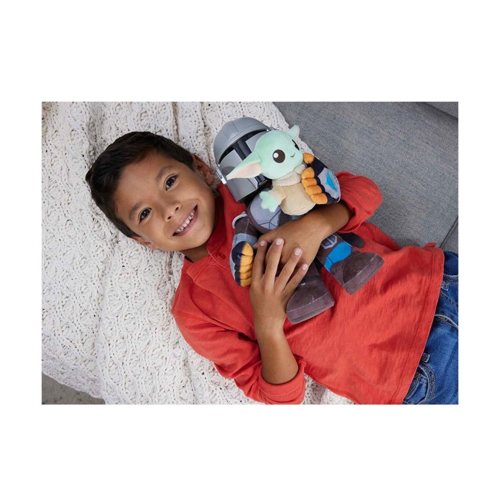 11 inç boyunda Mandalorian peluş, yumuşak bir peluş gövde üzerinde oyulmuş bir kafaya sahipken, daha küçük Grogu peluş, daha fazla oyun ve sarılma fırsatı için kollarında güvenle durur veya ayrılır. Gösteriden ikonik ifadeler ve Grogu'nun imzası olan yumuşak vokaller için Mandalorian'ın elini sıkın.