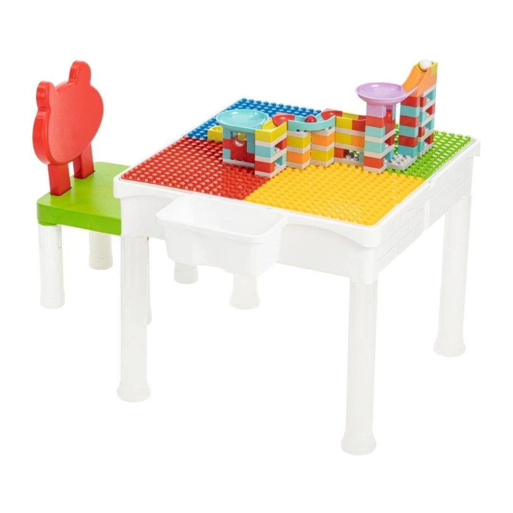 bir çocuk masası, sandalye ve 87 parça bir yapı bloğu içerir.
