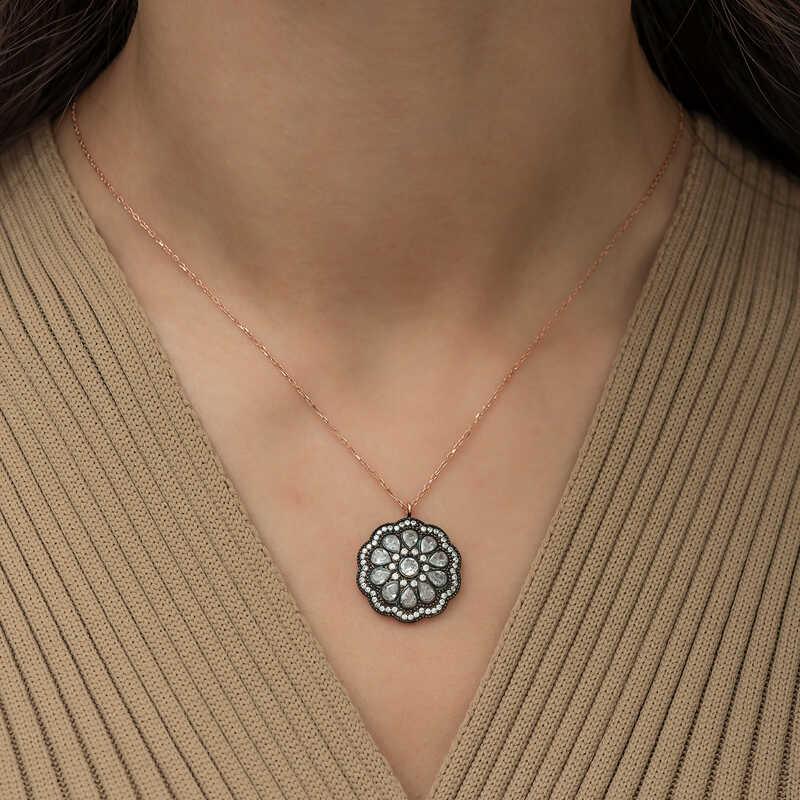 Silver diamond mount design necklaces reflecting sparkle and showiness aim to add elegance to your elegance. Modernly designed silver diamond mount flower pattern necklaces will highlight your feminine elegance. These necklaces integrate with your beauty both in daily use and special invitations and reveal eye-catching elegance. Diamond elegance continues to live love, passion and liveliness at every age and everywhere. Beautiful silver necklaces that fascinate with their showiness or highlight feminine elegance with their simple stylish design are waiting for you. Rose gold plating is made on silver. Silver women's necklace models with rose gold plating preserve their shine for a long time and oxidation is delayed. The stones on the silver necklace model are zircon. The average length of the silver chain is 45 cm. This diamond mount flower necklace is handmade. There may be a ± 10% deviation in the specified product weight due to silver and precious stones.