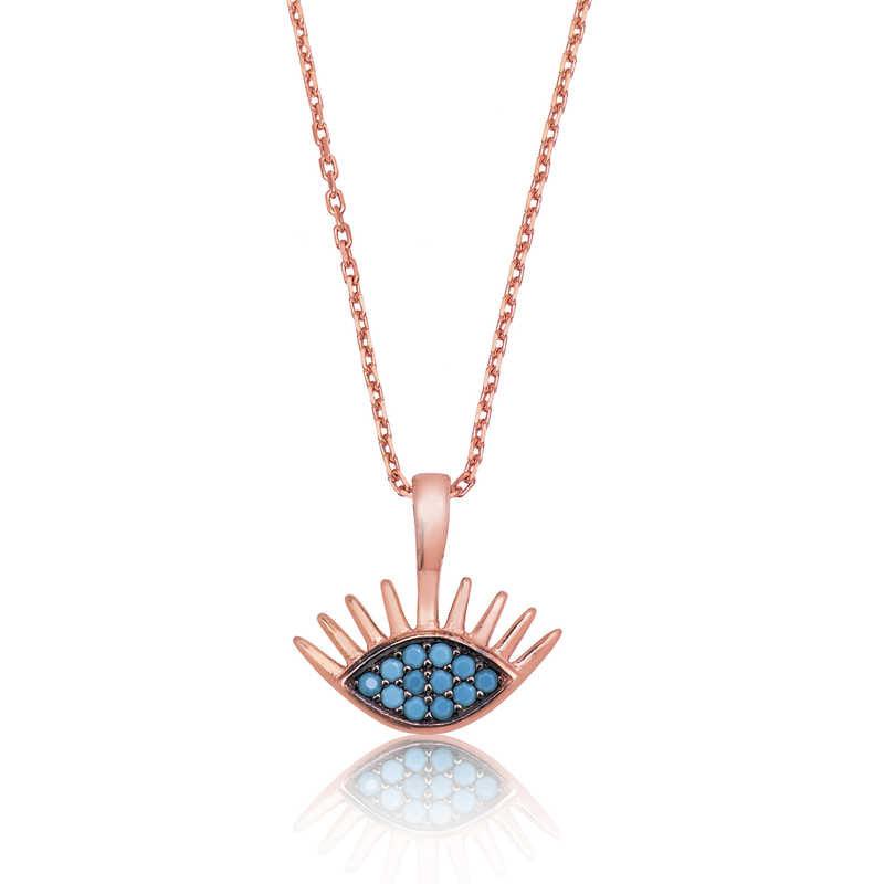 This model, which is loved in every period and does not compromise on its elegance; You can choose it as a birthday gift, Valentine's Day gift or a gift for mothers on special days. Blue eye women's necklace is made of 925 sterling silver. Rose gold plating is made on the silver necklace. Rose gold plated women's necklaces preserve their shine for a long time, turn the silver color into pink and delay oxidation. The average chain length is 45 cm. The stones on the necklace are turquoise colored zircon. As in all silver women's necklace models, this silver blue eye women's necklace model is also produced entirely by hand. There may be a ± 10% deviation in the specified average product weight due to silver and precious stones.