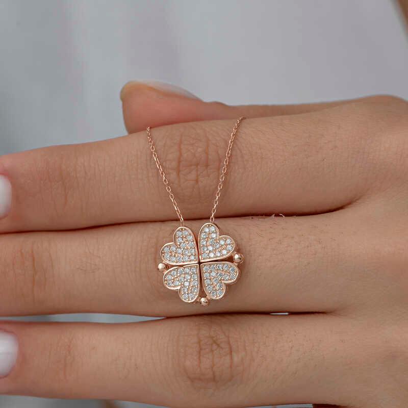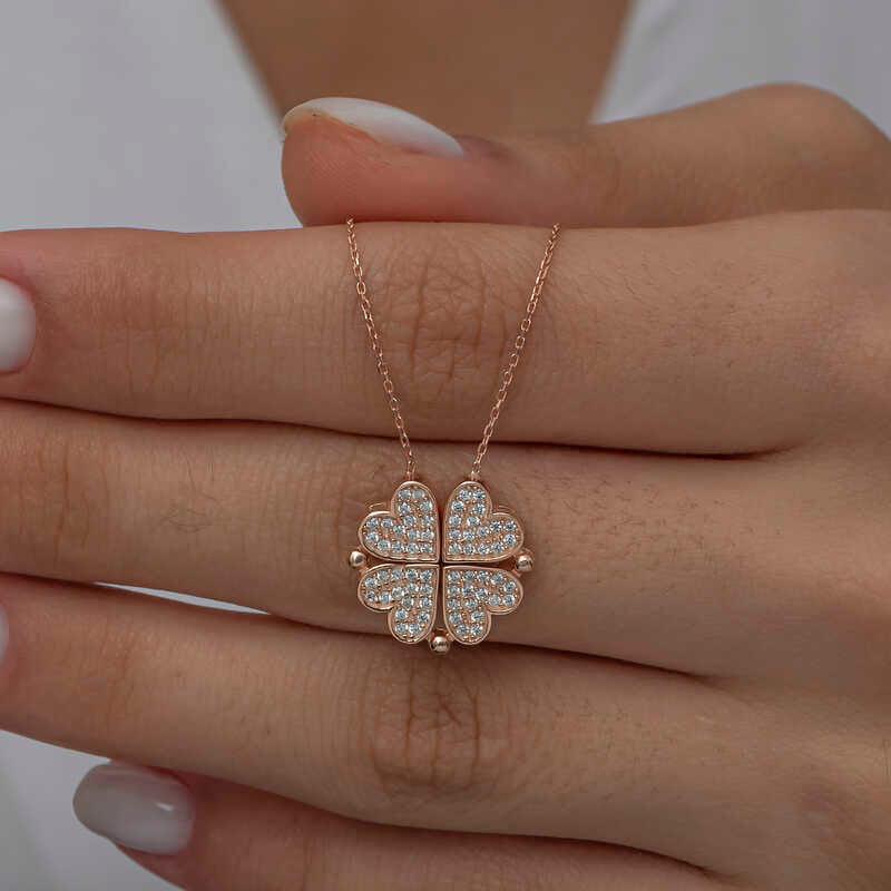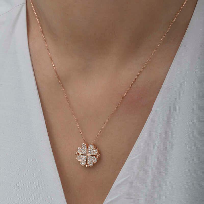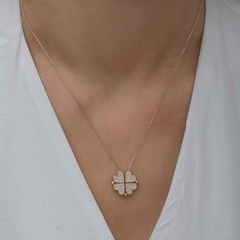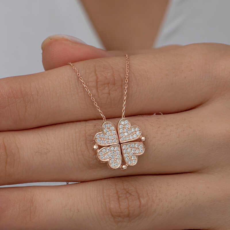 The four-leaf clover is considered a symbol of good luck in all cultures. The first leaf symbolizes hope, the second faith, the third love, and the fourth leaf luck. This fourth leaf is very rare in nature. The white heart-shaped clover women's necklace, decorated with silver white zircon stones, is a wonderful model that you can enjoy using and gifting to your loved ones. The silver white stone women's necklace is made of 925 sterling silver. Rose plating is applied on the silver necklace. Silver women's necklaces with rose plating preserve their shine for a long time and oxidation is delayed. The average silver chain length is 45 cm. As with all our silver women's necklace models, the silver heart-shaped clover women's necklace is also handmade. You can use it in 2 different ways. There may be a ± 10% deviation in product weight due to silver and precious stones.