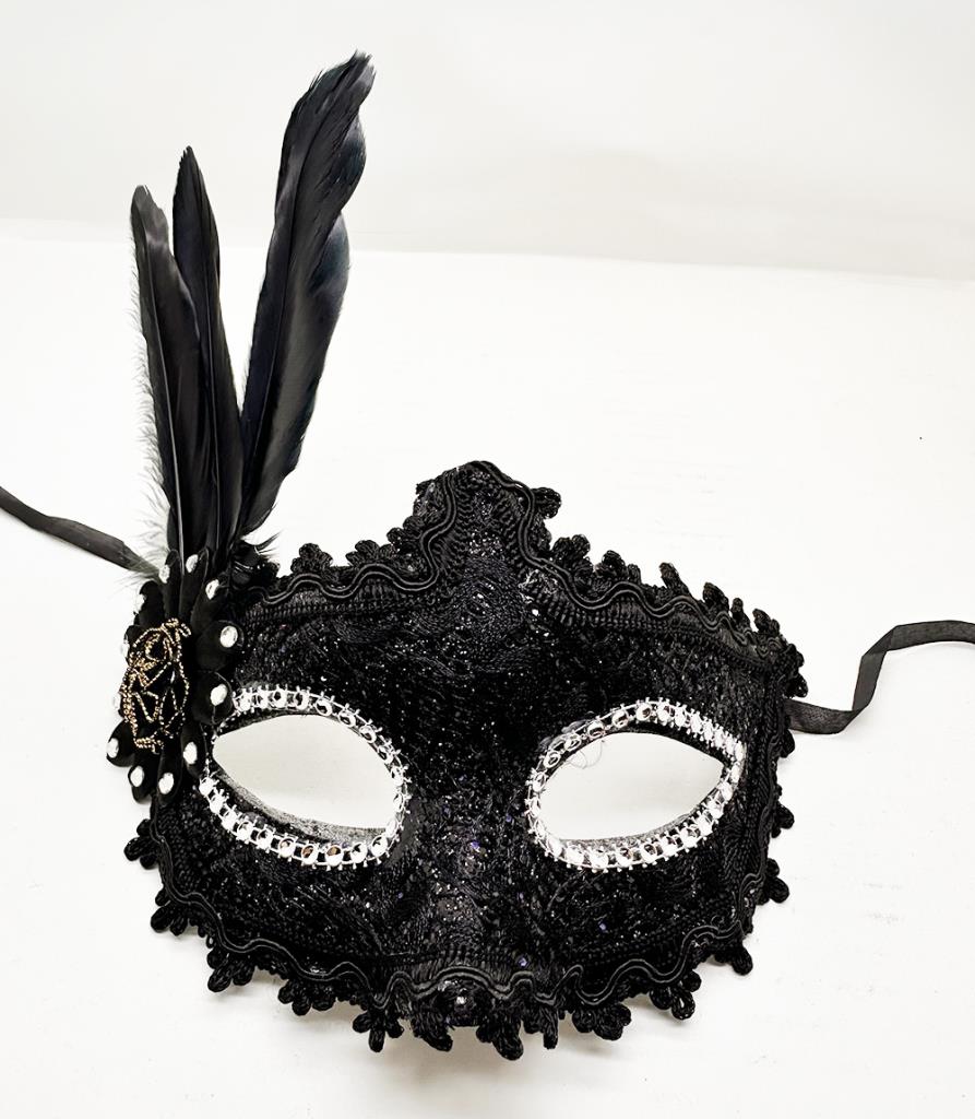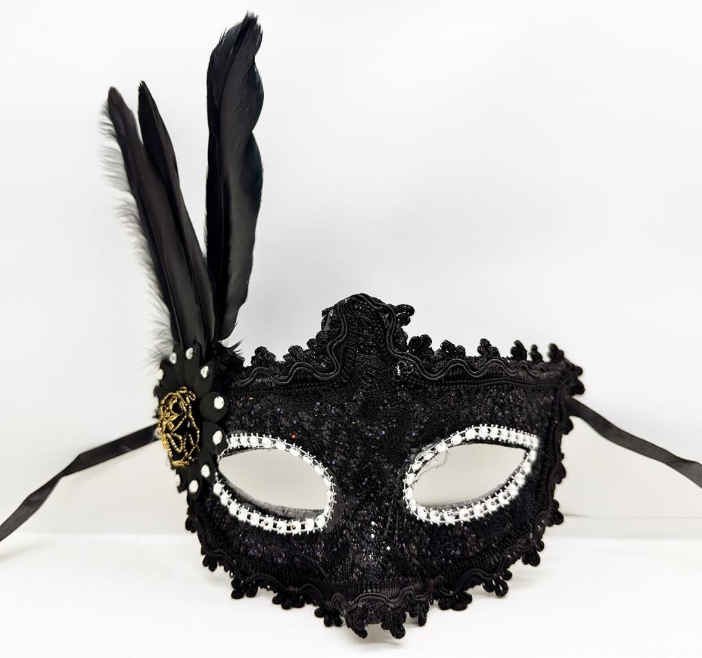 Le noir s'impose toujours comme une couleur noble et sophistiquée. Dans ce masque, l'élégance du noir classique est rehaussée de détails à plumes. La dentelle entourant les yeux ajoute de l'élégance à son style, tandis que les sections ornées de pierres ajoutent de l'éclat et de la brillance à votre masque.