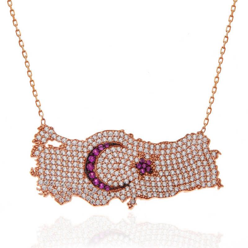 We know that the Turkish flag was inspired by the moon and star reflected in the blood pool. We offer you an unmissable opportunity to carry the sacred meaning of the flag around your neck and share it with your loved ones. You can gift this stylish necklace to your loved ones on Mother's Day, Valentine's Day, birthdays or special days. This stylish necklace is made of 925 sterling silver. Rose plating is applied on silver. All silver women's necklaces with rose plating preserve their shine for a long time. The necklace has a 45 cm long silver chain. As with all silver women's necklace models, the silver crescent star Turkey map women's necklace is also handmade. There may be a ± 10% deviation in the specified average product weight due to silver and precious stones.