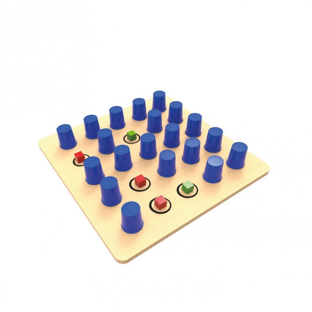 Pick up the cups, remember the location of the cubes, find three cubes of the same color and get the number!