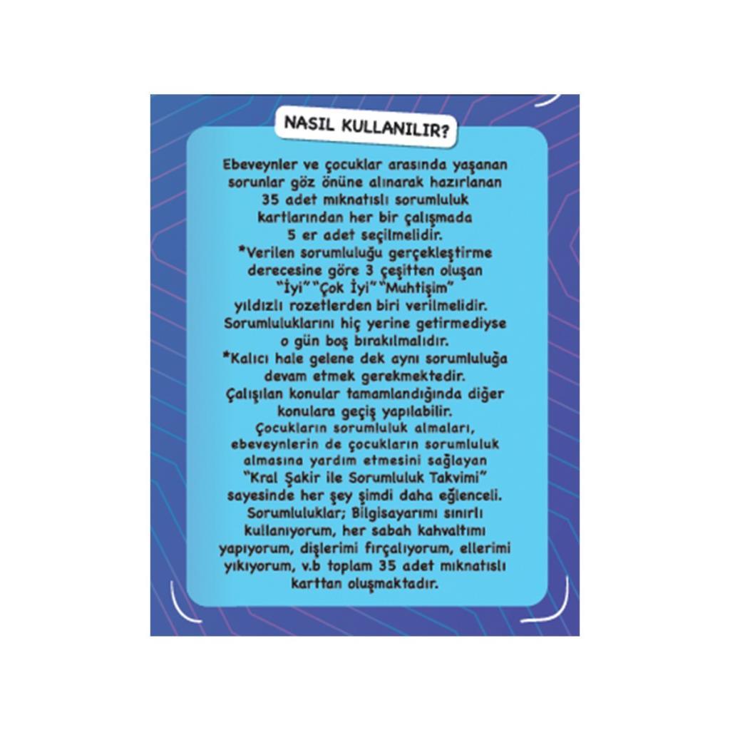 Considering the problems experienced between parents and children, 5 magnetic responsibility cards should be selected for each study. One of the 3 types of "Good" "Very Good" "Awesome" heart cards should be given according to the degree of fulfillment of the given responsibility. If the child has not fulfilled his/her responsibilities at all, that day should be left blank. It is necessary to continue with the same responsibility until it becomes permanent. When the subjects studied are completed, other subjects can be moved on. Everything is more fun now thanks to the "Responsibility Calendar with King Shakir", which allows children to take responsibility and parents to help children take responsibility. Responsibilities; I use my computer limitedly, I have breakfast every morning, I fix my teeth, I wash my hands, etc. It consists of a total of 35 magnetic cards.