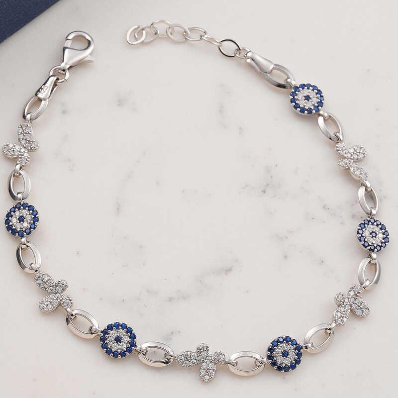 Butterfly; is one of the most popular motifs preferred by women. It reminds its lovers of the mystery of nature and the richness of human imagination. The spring butterfly, which symbolizes freedom, innocence and purity, is the expression of pure love and passion. This bracelet full of love is made of 925 sterling silver. The stones on the silver butterfly evil eye women's bracelet are zircon. This women's silver bracelet is rhodium plated. Bracelets with rhodium plating maintain their shine for a long time and oxidation is delayed. As with all silver bracelet models, this silver butterfly evil eye women's bracelet model is also produced entirely by hand. There may be a ± 10% deviation in the specified average product weight due to silver and precious stones.