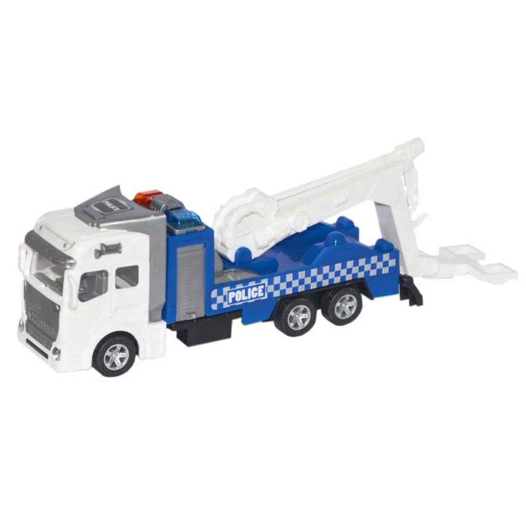 Pullback Police Tow Truck 21 cm The Tow-and-Trap Police Tow Truck has a tow-and-drop feature. The truck's towing arm is...