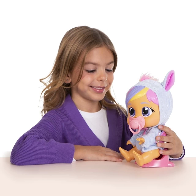 Jenna, who comes in a purple onesie with embroidered clouds and purple wings, cries with tears, but calms down immediately when she puts on her pacifier.