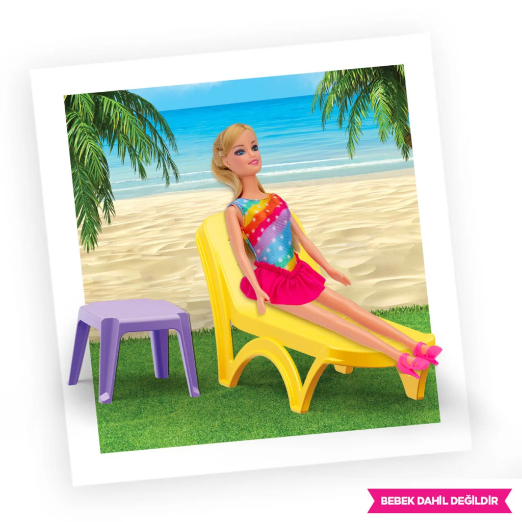 Mini accessory set consisting of a pool, slide, umbrella, sun lounger and coffee table.