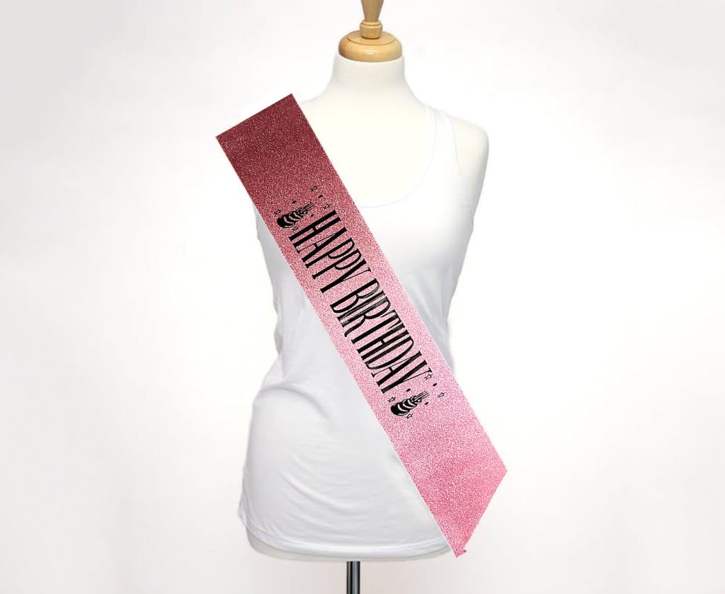 Pink and Black Large "Happy Birthday" Written Glittery and Shiny Sash Belt is a perfect choice for those who want to have a glamorous and stylish look on their birthday. This belt attracts all the attention with its glittery and shiny design, and it clearly shows that you are the star of your birthday with its large and black "Happy Birthday" writing.