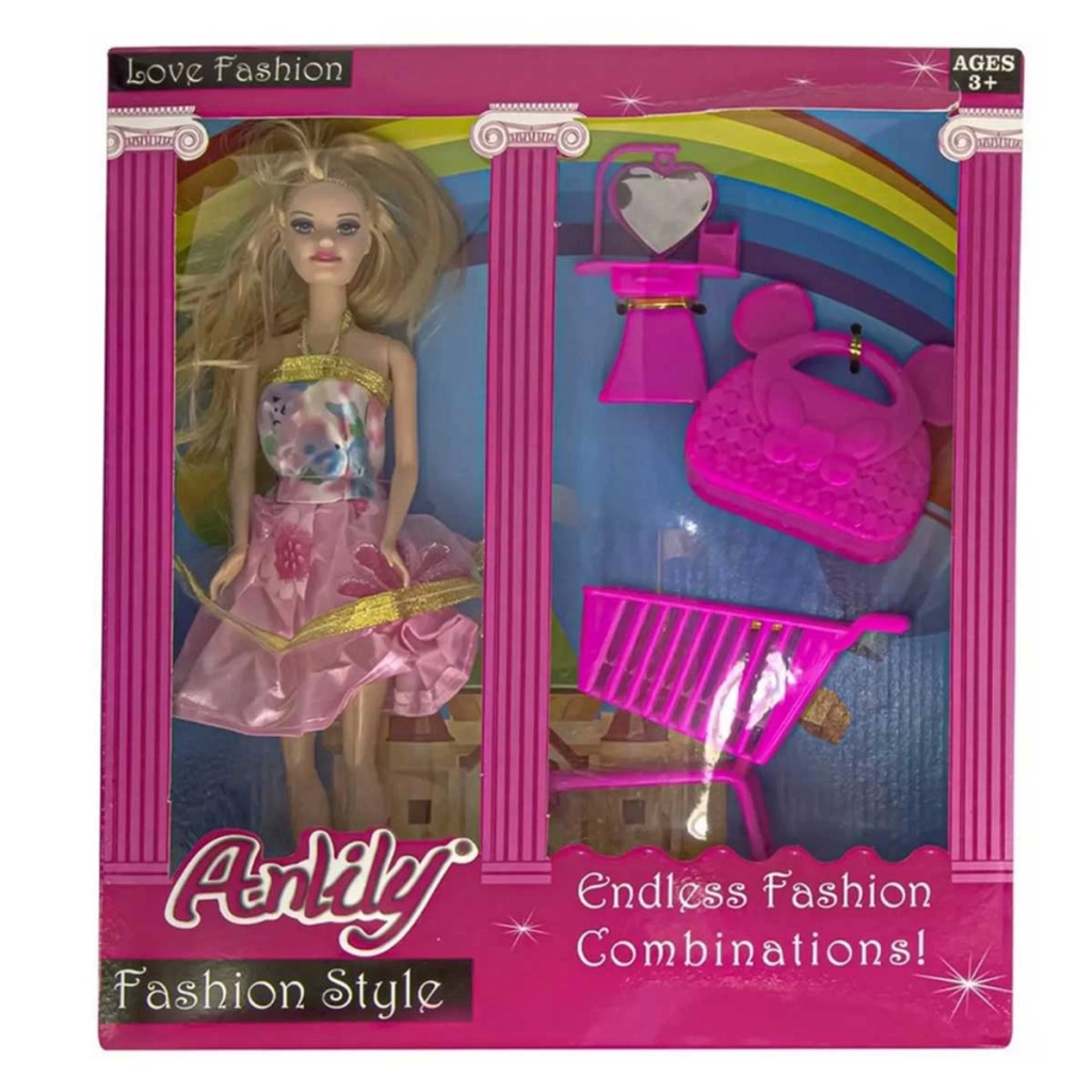It contains 1 Doll, 1 Shopping Cart, 1 Bag, 1 Mirrored Make-up Table. Colors and decorations