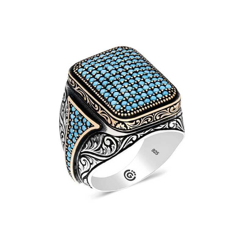 This men's ring model, consisting of zircon turquoise stone on silver, is a stylish accessory that you can use at any time of the day. You can gift this ring to yourself or your loved ones on your birthday, father's day or special days. The turquoise stone men's ring model is made of 925 sterling silver. Oxide coating is applied to silver. Silver men's ring models with oxide coating preserve their shine for a long time. As with all men's rings, the silver zircon turquoise stone men's ring model is also produced by hand. There may be a ± 10% deviation in the specified average product weight due to silver and precious stones.