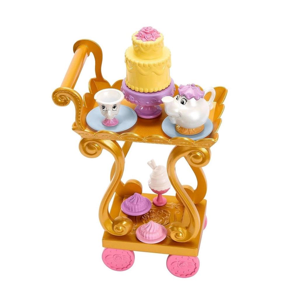 Wonderful Tales Belle has all the pieces kids need to host a fun tea party with the princess heroine from Disney's Beauty and the Beast: 3 character figures, gold-colored tea trolley, tea tray, food and more.