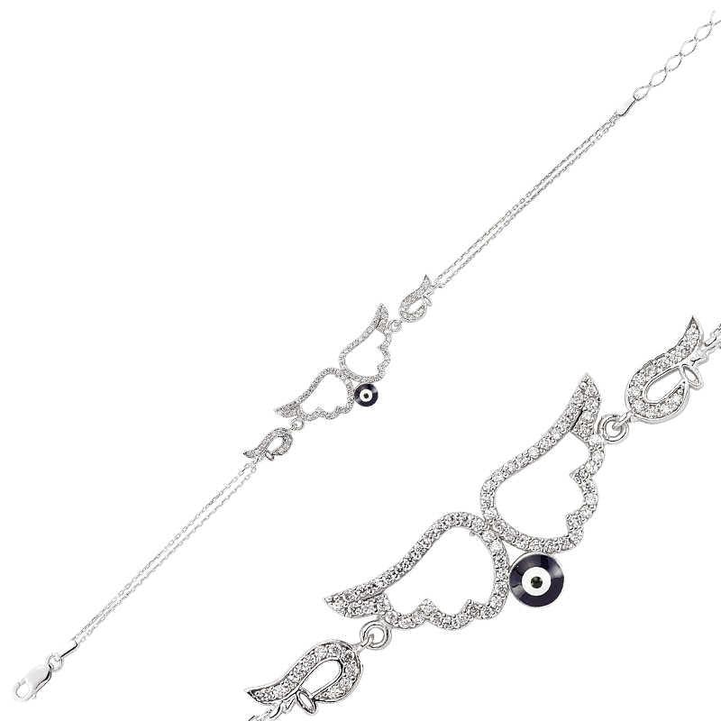 Angels are symbols of purity and cleanliness. This bracelet gives the message that the person who is given the gift is as pure and clean as an angel ... This stylish bracelet is a perfect option that can be preferred on special occasions as a birthday gift, Valentine's Day gift or a gift for mothers. This special angel wing design is made of 925 sterling silver ... The stones on the designed angel wing women's bracelet are zircon. This women's silver bracelet model is rhodium plated. Silver women's bracelet models with rhodium plating preserve their shine for a long time and delay oxidation. As with all silver bracelet models, this silver angel wing women's bracelet model is also produced by hand. There may be a ± 10% deviation in the specified average product weight due to silver and precious stones.
