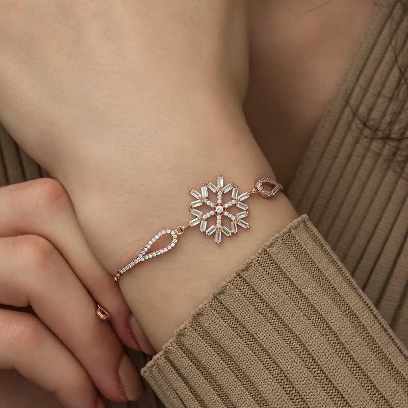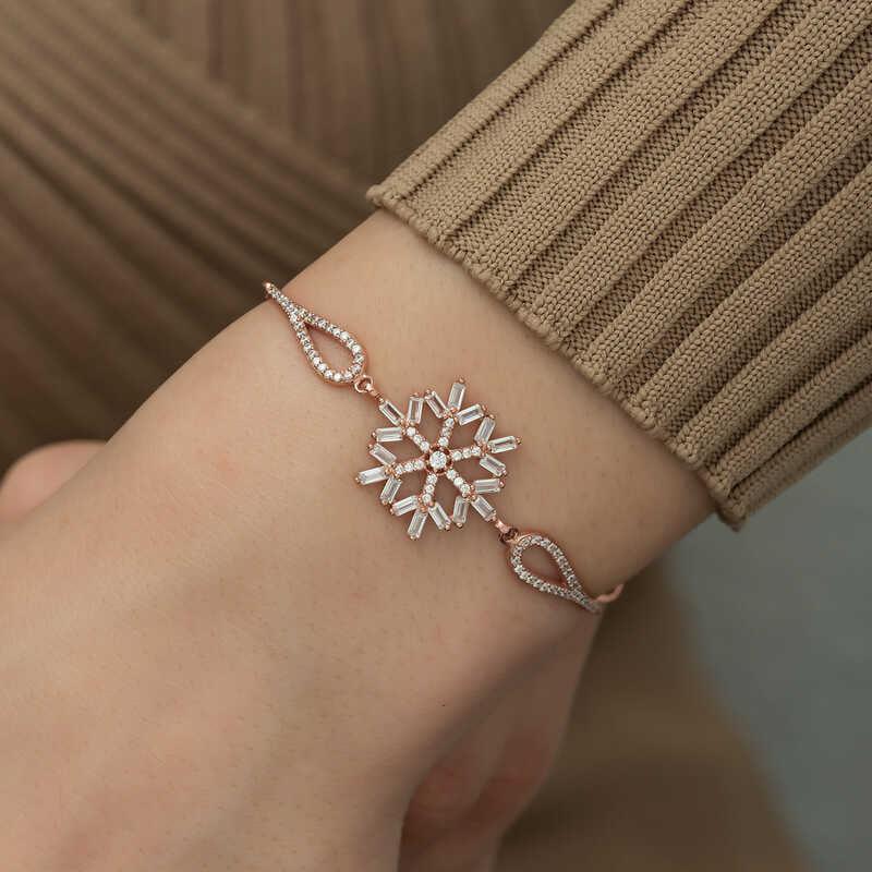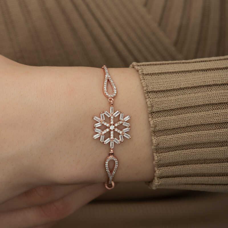 The sparkle and clarity of women are specially designed to resemble snowflakes. Another feature that makes them special is that each snowflake is unique and has a separate value like women. Its nobility has managed to attract attention in every period. In addition, it symbolizes that people can live happily without harming each other just like snowflakes. This stylish bracelet is a perfect option that can be preferred on special occasions as a birthday gift, Valentine's Day gift or a gift for mothers. The bracelet is made of 925 sterling silver. Rose gold plating is applied on silver. Rose gold plating products preserve their shine for a long time and oxidation is delayed. As with all silver women's bracelets, this silver rose baguette stone snowflake women's bracelet is also entirely handmade. There may be a ± 10% deviation in the average product weight specified due to silver and precious stones.