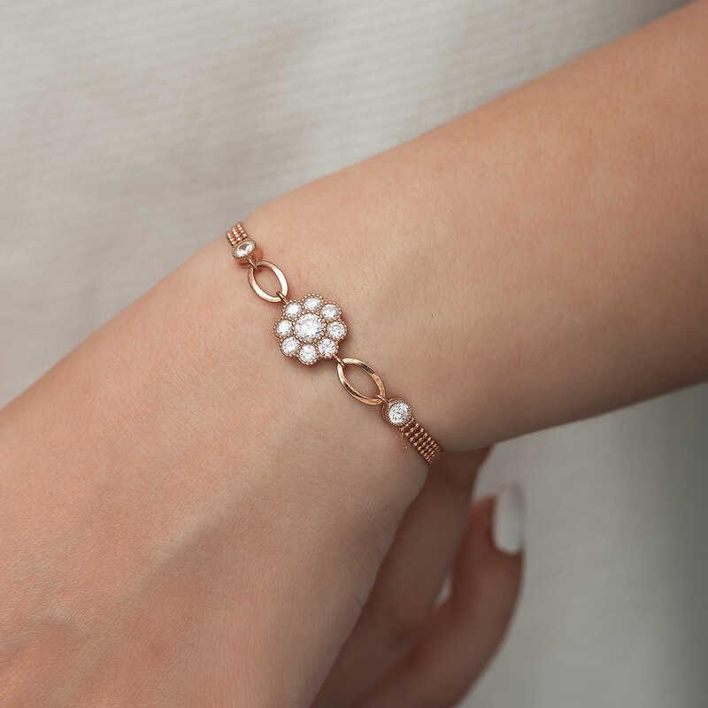 An ideal option for women who love a stylish and fantasy look. In the collections; the bracelet created with drop and zircon stones for women who are after showiness and elegance awaits you with a model suitable for every taste and concept. The flower model women's bracelet model is made of 925 sterling silver. Rose coating is made on silver. Rose plated women's bracelet models preserve their shine for a long time. As in all silver women's bracelet models, the silver flower model women's bracelet model is also produced by hand. There may be a ± 10% deviation in the specified average product weight due to silver and precious stones.