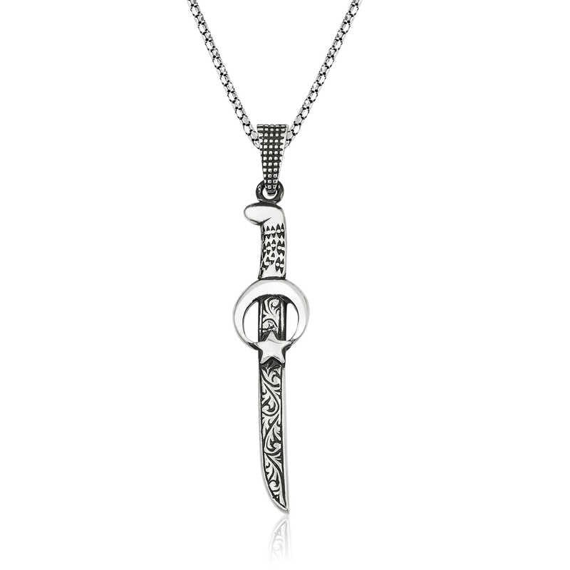 The sword is a sharp-edged, pointed weapon that has been used by many civilizations throughout history, and which can be of various sizes, and which was used by mankind to demonstrate and apply his power before the invention of weapons. The size of the sword has been different in different nations throughout history. When the Turks migrated to Central Asia, they established sword-making centers. The sword tradition continued during the Seljuk and Ottoman periods. The feature that distinguished Anatolian swords from the swords of the West was that they were curved, very watered and very easy to use due to their curvature. While the Turks attributed such importance to the sword that they could swear on it, they argued that iron and the fire that melted it had a spiritual aspect. Swords could work wonders on skilled wrists, and in ancient Turkish civilizations, cavalrymen wanted to be buried with their horses and swords. The sword is one of the most beautiful proofs of what man can do with fire on iron, a difficult metal. If you are interested in ancient heroism and find close combat authentic, then all you need is a sword necklace. Silver crescent star figured sword men's necklace is made of 925 sterling silver. Oxide coating is applied to the silver to give it an aged appearance. Chain length is 55 cm. Due to silver and precious stones, there may be ± 10% deviation in product weight.