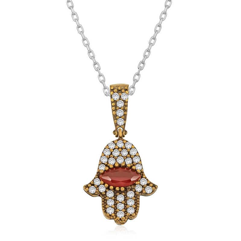 The Hand of Fatma, also known as Hamse, means five and shows the number of fingers on a hand. According to legend, while Hz. Fatma was roasting halva in the kitchen one day, her husband Hz. Ali saw her dipping her hand into the cooked halva and stirring it. From that day on, it was believed that her hand was sacred, powerful and invincible. Every difficulty would be overcome with her hand. This wonderful silver women's necklace model, designed based on this symbol whose power is still believed in in a wide geography, is produced with 925 sterling silver and bronze metals. There is an oxide coating on the silver Fatma hand authentic women's necklace. Authentic silver women's necklace models with oxide coating gain an old look. A 45 cm long 925 sterling silver chain will come with the necklace. As with all our women's authentic necklace models, the silver Fatma hand authentic women's necklace model is produced by hand labor. There may be a ± 10% deviation in the specified average product weight due to silver and precious stones.