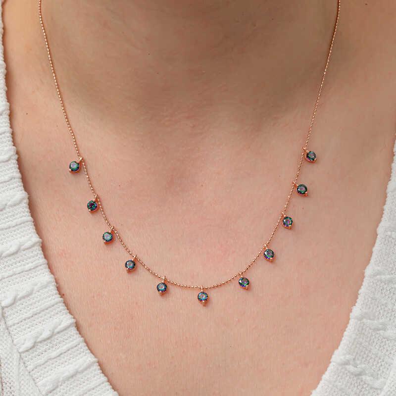 Topaz is a rare gemstone thanks to its dazzling sparkling, bright glassy appearance. For this reason, colorless topaz can be confused with diamond. It has different colors, these are colorless, white, gray, dull blue, yellow, red, etc. Mystic topaz is more effective in people of Leo, Virgo, Scorpio, Sagittarius, Pisces. Some of its energetic benefits include its ability to relieve stress. It gives a sense of calm and peace, cheers up. It provides spiritual balance in the person by reducing the different effects of the moon phases on people. It helps meditation. This stylish necklace model is made of 925 sterling silver. Your love life will be activated with this necklace symbolizing love. How about taking your elegance one step further with a lucky necklace adorned with mystic topaz stones. The chain length of this stylish necklace model, which is rose-plated on silver, is 45 cm. All of our products are handmade. There may be a ± 10% deviation in the average product weight specified due to silver and precious stones.