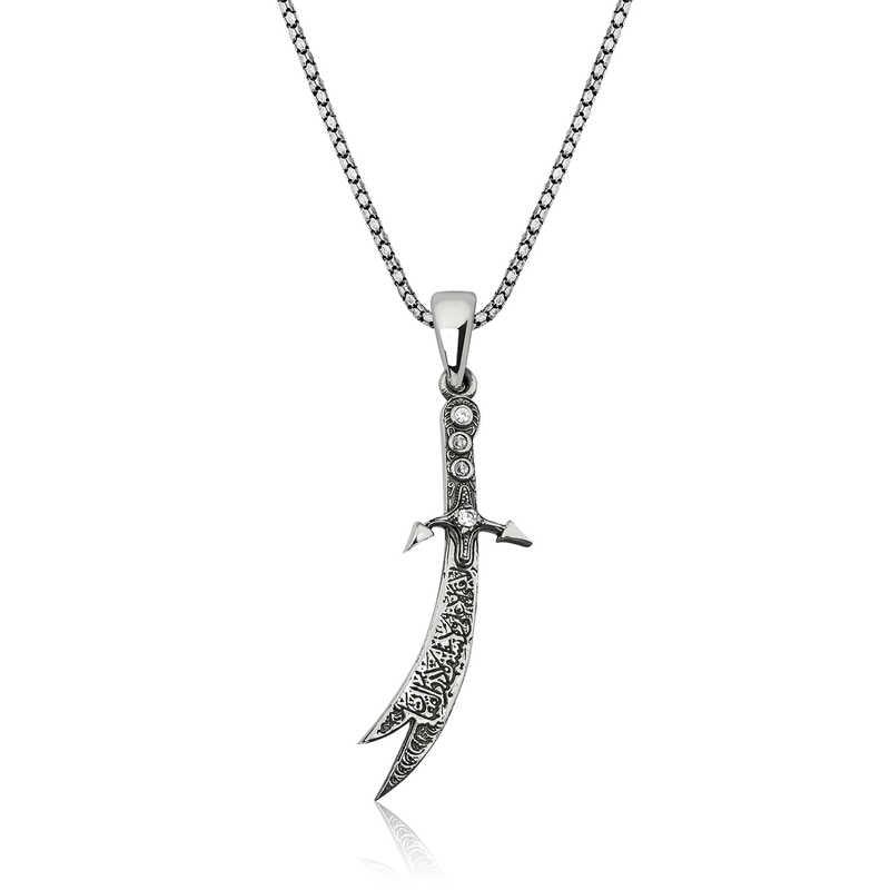 Hz. Ali showed great heroism in the Battle of Uhud. While trying to protect the Prophet in the battle, his sword broke. Seeing this, the Prophet gave him his own sword, Zulfikar. With the sharpness of the sword, he split other swords in half and wrote epics in battles. Hz. Ali is now in battles with his Zulfikar sword... It is known that the sword was taken to heaven after Hz. Ali's death. According to another narration, it is known to be between the Tigris and Euphrates rivers. The person who will rule the Islamic armies will own that sword and be the commander-in-chief of the armies. You can choose this stylish necklace as a birthday gift, Valentine's Day gift or as a gift on special occasions. The necklace is made of 925 sterling silver. Oxide coating is applied to silver. Silver necklaces with oxide coating preserve their shine for a long time and give the silver a black color. As with all necklaces, this silver Zulfikar sword necklace is also produced entirely by hand. The stones on it are zircon. Due to silver and precious stones, there may be a ± 10% deviation in the stated average product weight.