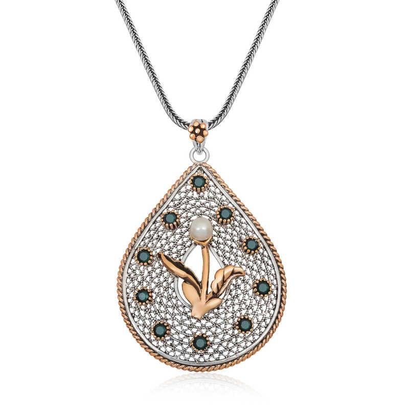 Ce modèle de collier authentique en forme de fleur de perle au design élégant est fabriqué à partir d'argent sterling 925 et de métaux en bronze. Ce modèle de collier pour femme à motif de fleur de perle authentique, fabriqué à partir de pierres de zircon rouges et vertes, est doté d'un revêtement en oxyde. Les modèles authentiques de colliers pour femmes en argent oxydé conservent longtemps leur état du premier jour. La chaîne qui accompagne le modèle de collier authentique pour femme en argent est en argent sterling 925 et sa longueur est de 55 cm. Comme tous les modèles de colliers en argent authentiques, le modèle de collier fleur de perles en argent authentique est également réalisé à la main. En raison de l'argent et des pierres précieuses, il peut y avoir un écart de ± 10 % dans le poids moyen indiqué du produit. Ce collier authentique, indémodable et qui plaira à toutes les femmes désireuses d'obtenir un look élégant, n'attend plus que vous.