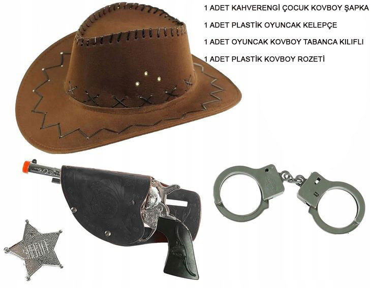 Ensemble de 4 pièces avec chapeau de cowboy marron pour enfant, badge, arme et menottes