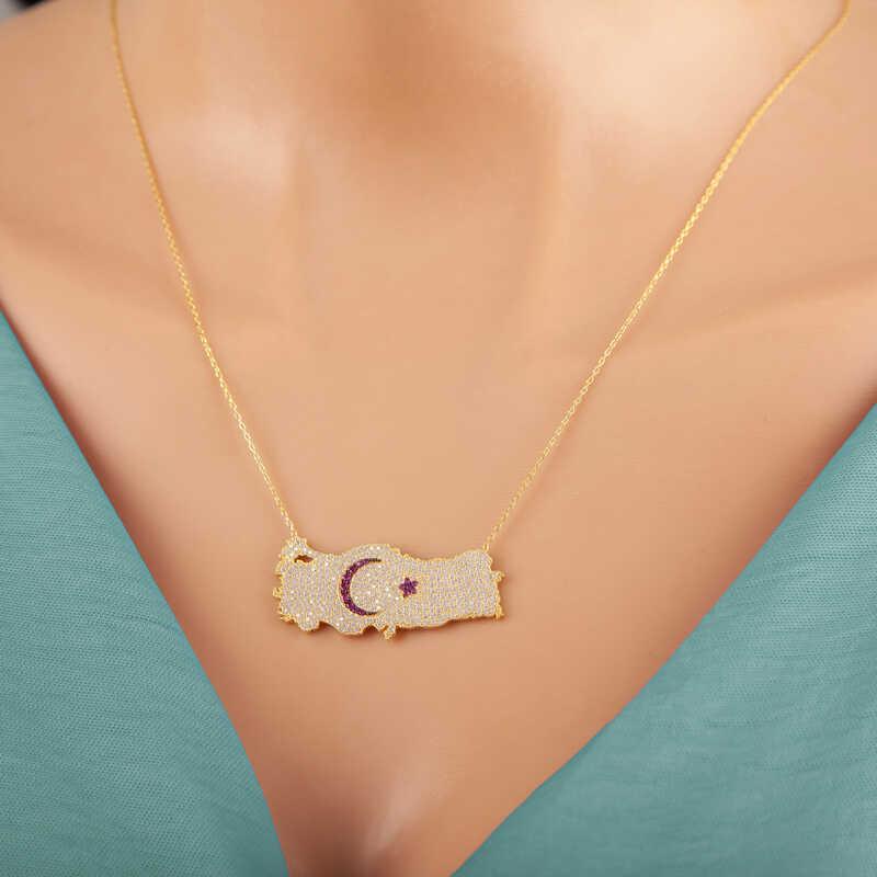 Collier pour femme avec croissant de lune et étoile en argent et or, carte de la Turquie
