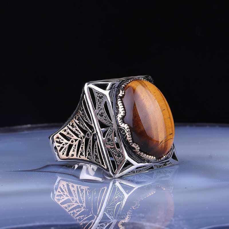Ce modèle de bague pour homme, réalisé en pierre œil de tigre sur argent, est un accessoire élégant que vous pourrez utiliser à tout moment de la journée. Cette bague; Vous pouvez l'offrir en cadeau à vous-même ou à vos proches à l'occasion de leur anniversaire, de la fête des pères ou de journées spéciales. Le modèle de bague pour homme en pierre œil de tigre ovale courbée est fabriqué en argent sterling 925. Le revêtement d'oxyde est réalisé sur l'argent. Les modèles de bagues pour hommes en argent oxydé conservent leur éclat pendant longtemps. Comme toutes les bagues pour hommes, le modèle de bague pour homme en pierre œil de tigre argentée est également fabriqué à la main. En raison de l'argent et des pierres précieuses, il peut y avoir un écart de ±10 % dans le poids moyen indiqué du produit.