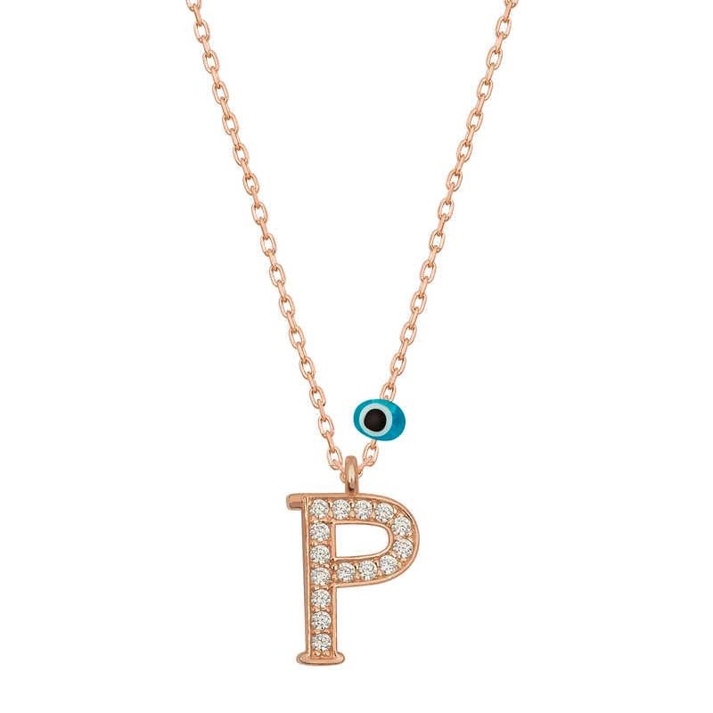 Collier pour femme en argent avec pendentif rose mauvais œil et lettre P