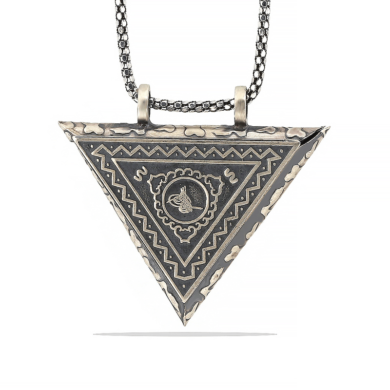 Collier amulette Tughra ouvrable en forme de triangle argenté