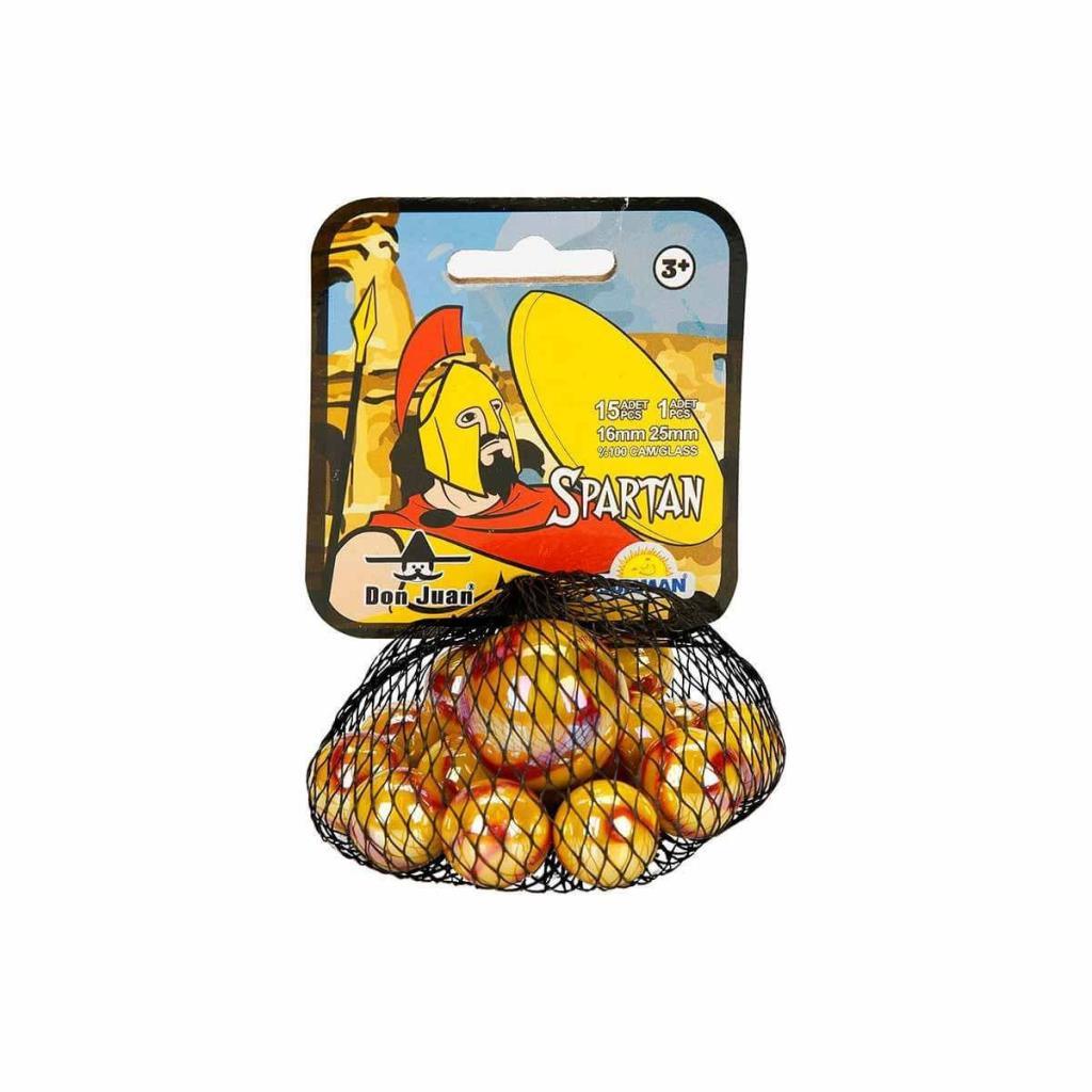 Dans le filet; Il y a un total de 16 billes de verre, 15 de taille normale et 1 de grande taille.