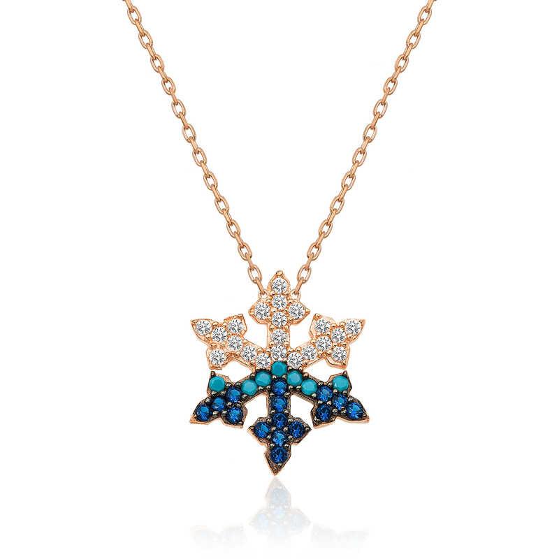 Kadınların ışıltısı, berraklığı kar tanesine benzetilip özel olarak tasarlanmıştır. Kar tanelerinin her birinin bayanlar gibi eşsiz ve ayrı kıymette olması onları özel kılan bir diğer özelliktir. Kar tanesinin asilliği her dönemde dikkat çekmeyi başarmıştır. Bunun yanında insanların tıpkı kar taneleri gibi birbirlerine zarar vermeden de mutlu bir şekilde yaşayabileceklerini sembolize etmektedir. Bu şık kolye; doğum günü hediyesi, sevgililer günü hediyesi veya annelere hediye olarak özel günlerde tercih edilebilecek mükemmel bir seçenektir. Kolye, 925 ayar gümüşten imal edilmiştir. Gümüş üzerine rose altın kaplama yapılmıştır. Rose altın kaplama yapılan ürünler parlaklığını uzun süre muhafaza eder, gümüşü pembe renge dönüştürür ve oksitlenmesi gecikir. Tüm gümüş bayan kolyelerde olduğu gibi bu gümüş kar tanesi bayan kolye de tamamı el emeği ile üretilmiştir. Gümüş ve değerli taşlar nedeniyle belirtilen ortalama ürün ağırlığında ± %10 sapma olabilmektedir.