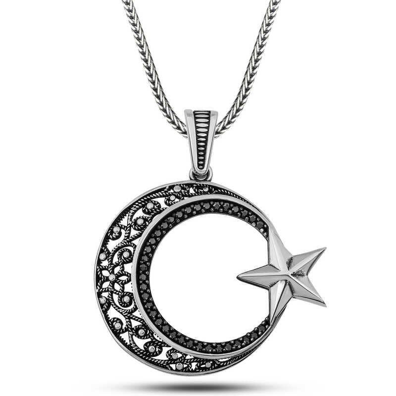 Gümüş Zirkon Taşlı Desenli Ay Yıldız Erkek Kolye