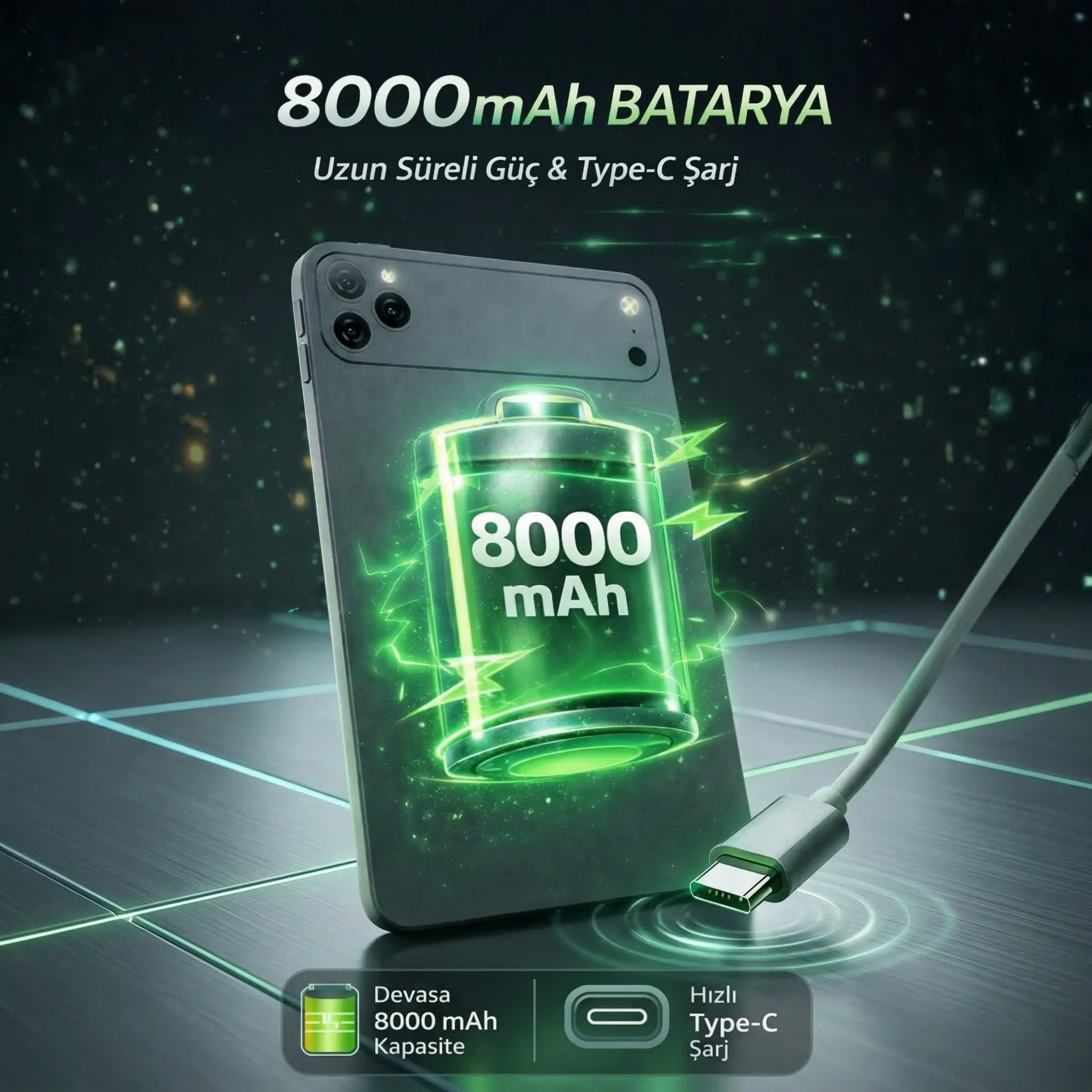 Güçlü bataryası sayesinde uzun süre şarj ihtiyacı duymadan tabletinizi kullanabilirsiniz. Seyahatlerde, okulda veya günlük kullanımda kesintisiz deneyim sağlar.