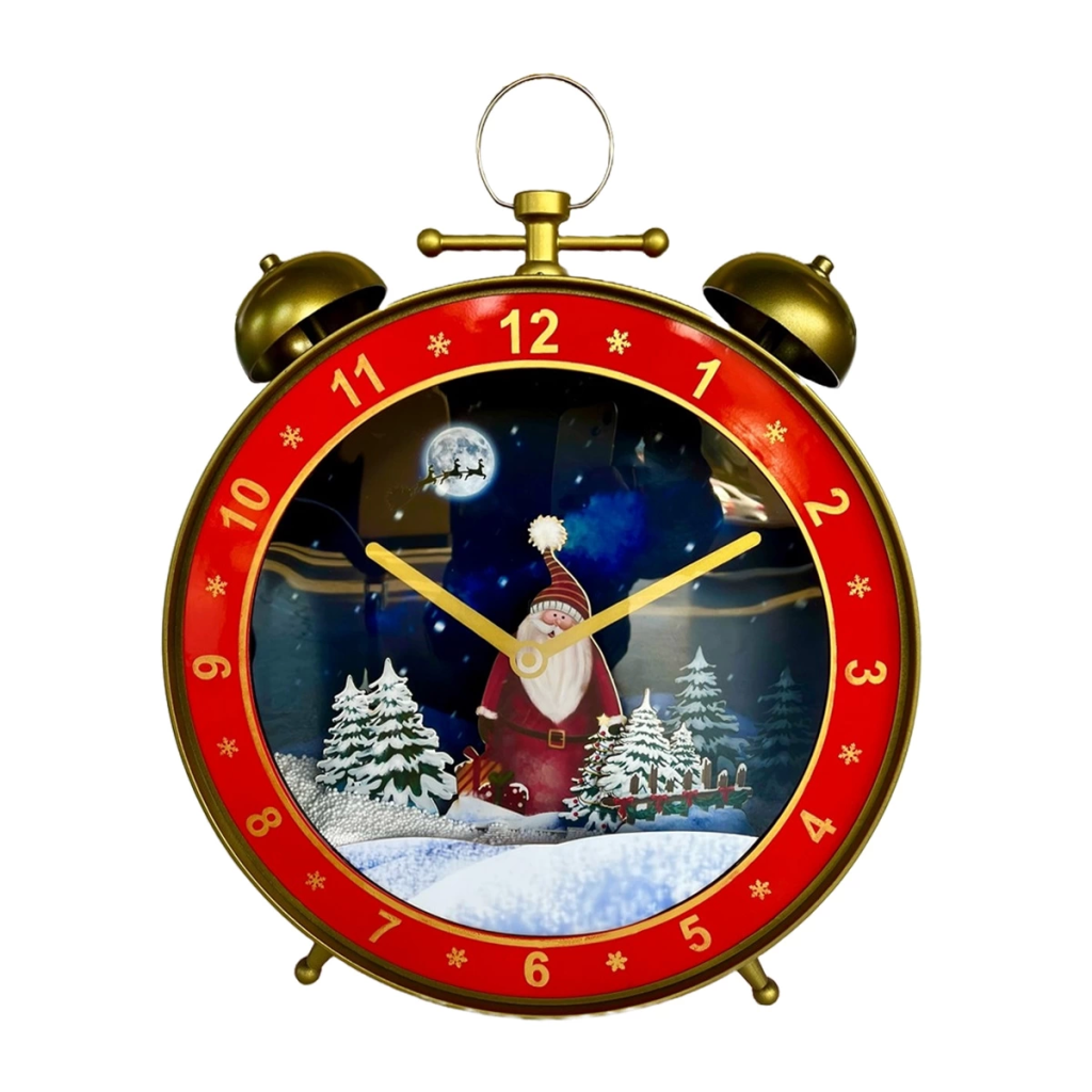 Saatin arka planında ince detaylı kar taneleri, çam ağaçları ve Noel süsleri yer alırken, kırmızı, yeşil ve altın tonları ile tamamlanmış
